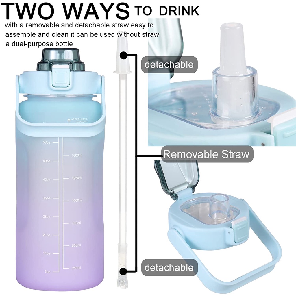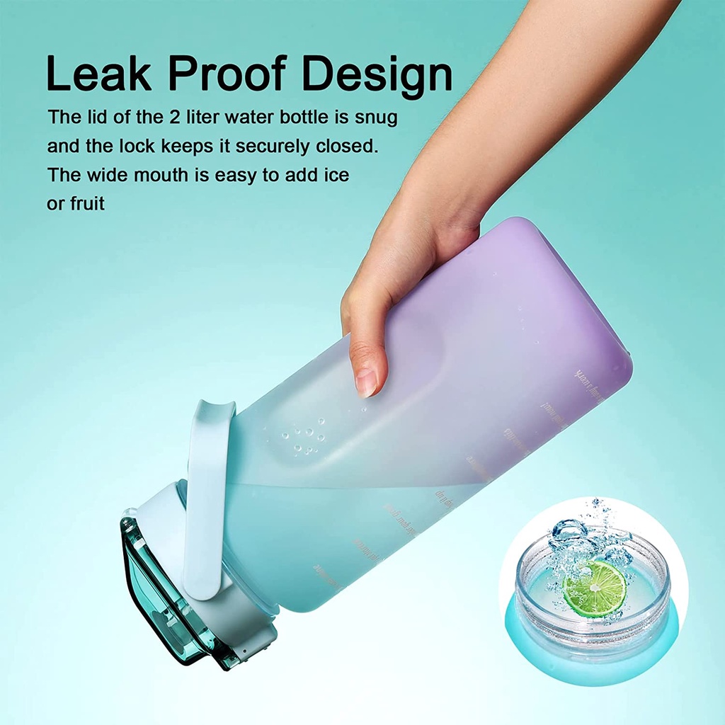Gemful Large Water Bottle 2L with Time Marker and Straw BPA-Free 水瓶 Botol Air Sukan