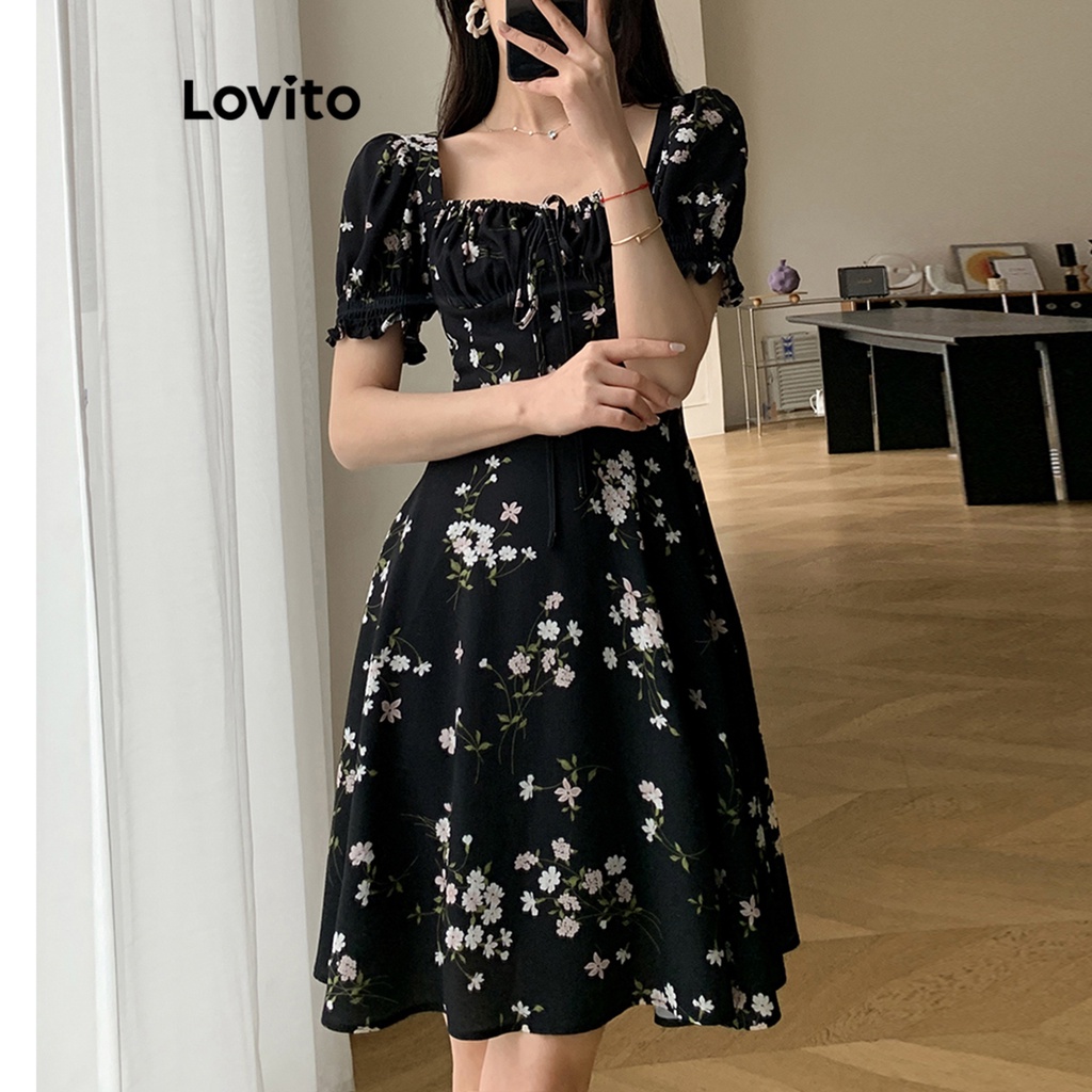 Lovito Casual Ditsy Floral Lace Up Dress for Women L68ED190 (Black)