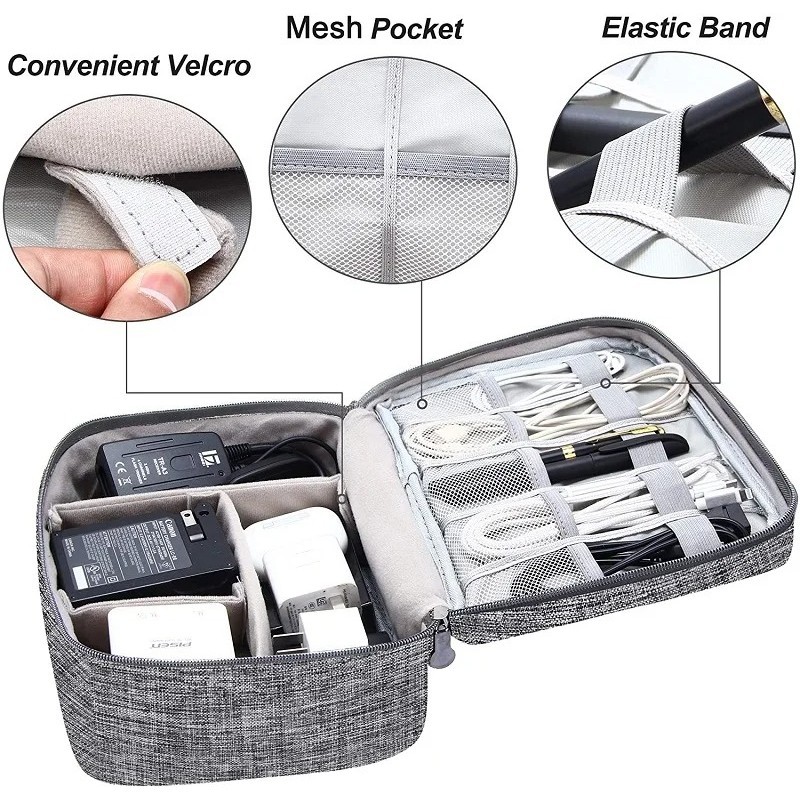 Colour:1 Grey & 1 Red Material Quality:Good Bought a light grey and a red cable storage bag to store the various cables, plugs, battery bank, travel adapters etc. Comes with many compartments and elastic bands to hold multiple items. A very convenient bag to keep the various items and can be used at home and for travel. Satisfied with the purchase.