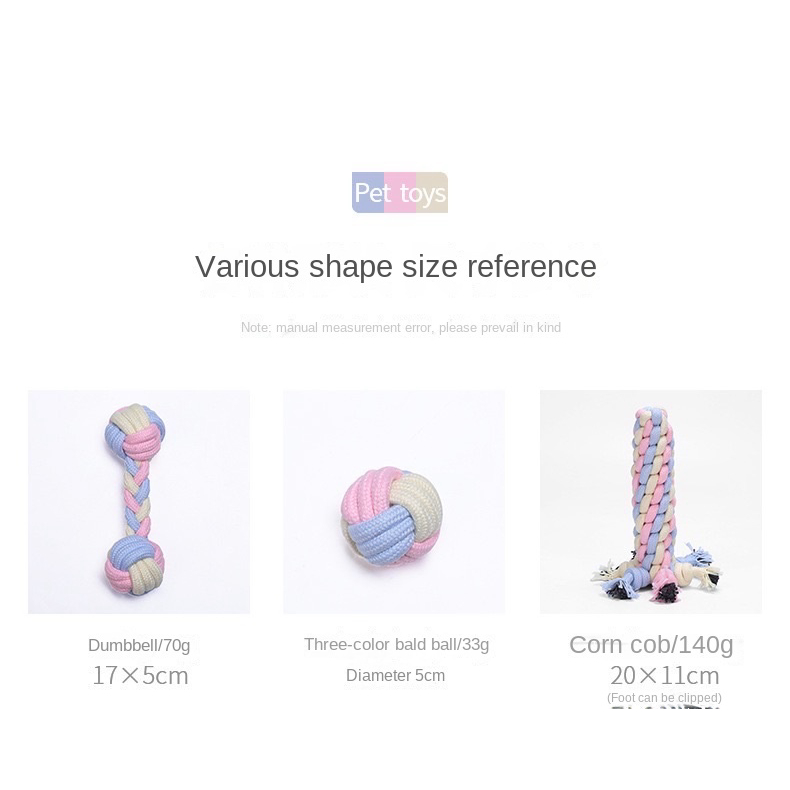 Appearance:Cute and pretty Quality:Good Suitability:For playing fetch and chewing My lil puppy loves chewing on them and playing fetch with them! The colours are pretty and aesthetic too! Think it will last quite a long time cuz the rope material is thick. Affordable too!