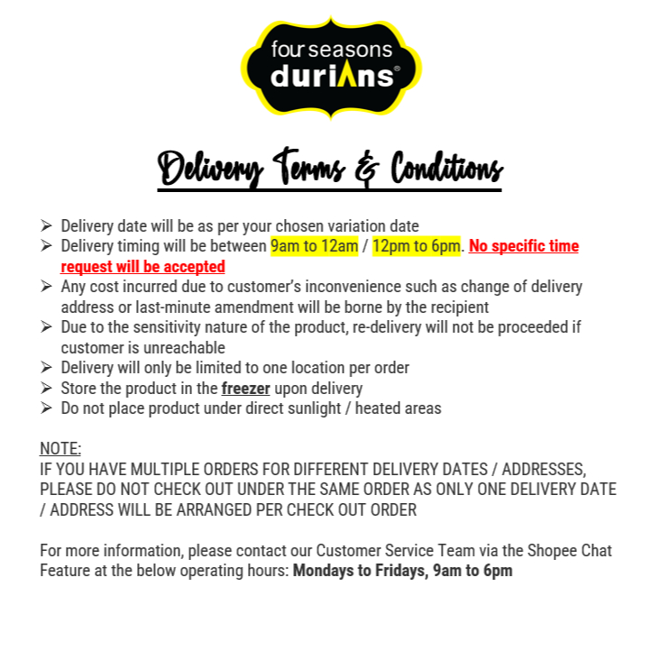Order on 07/09 arrived on 09/09 as within the booked timing. Have try one and is delicious not too sweet just nice. Good balance of durain favour. Thank you Seller & delivery person. Good job !!! ??
