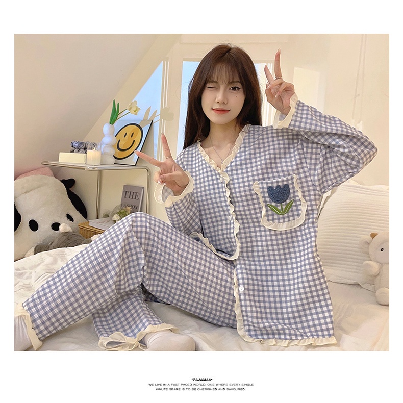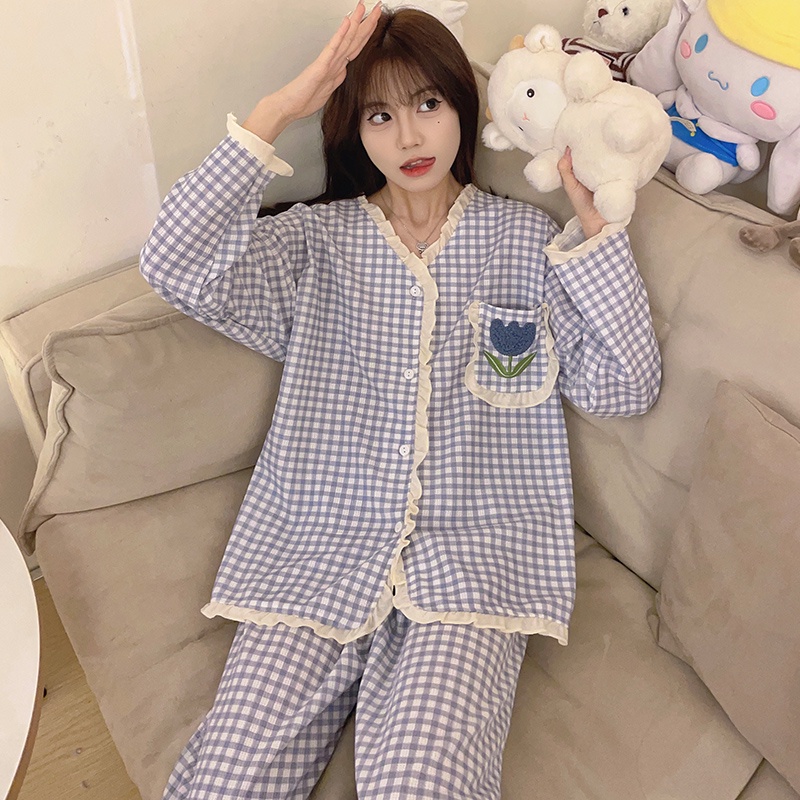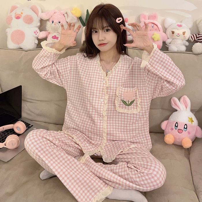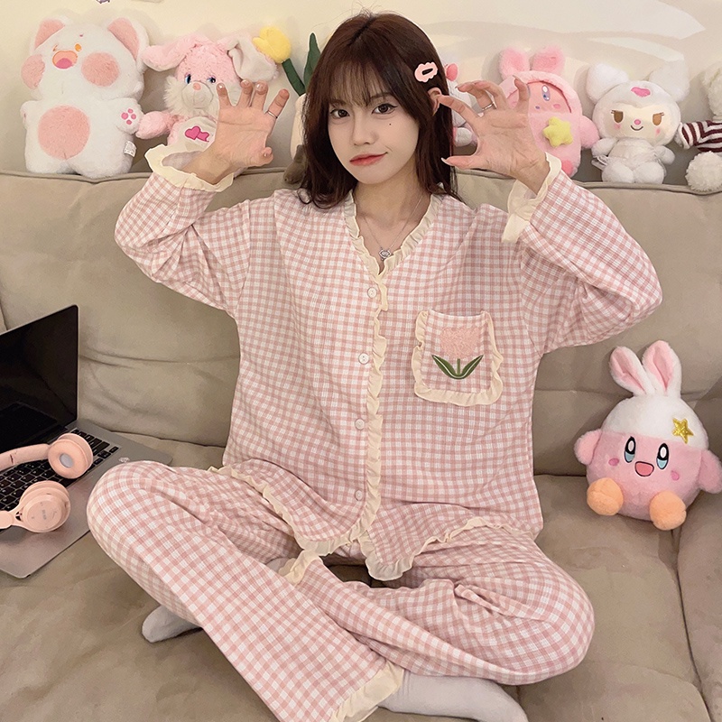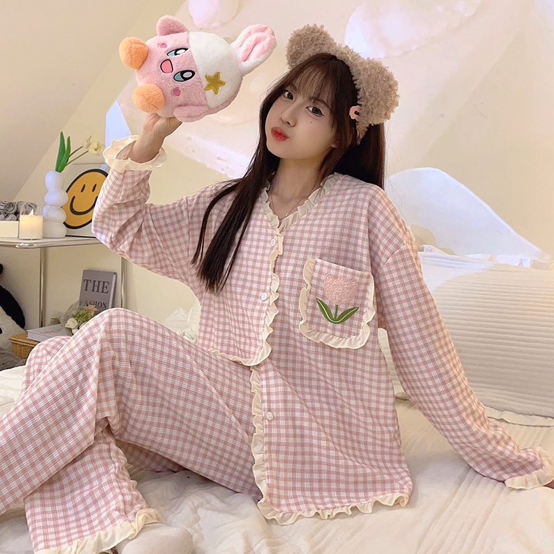 M-5XL Plus size Sleepwear Woman Cotton Pyjamas Women Long sleeve Pajamas Set Japanese Loose Grid Cute Loungewear