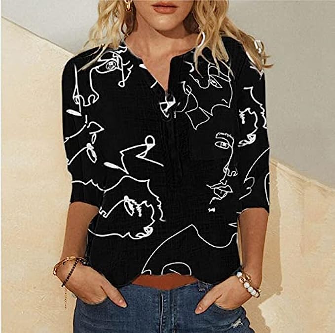 Womens Tops Summer Floral Printed Tee Shirt Button Neckline 3/4 Sleeve